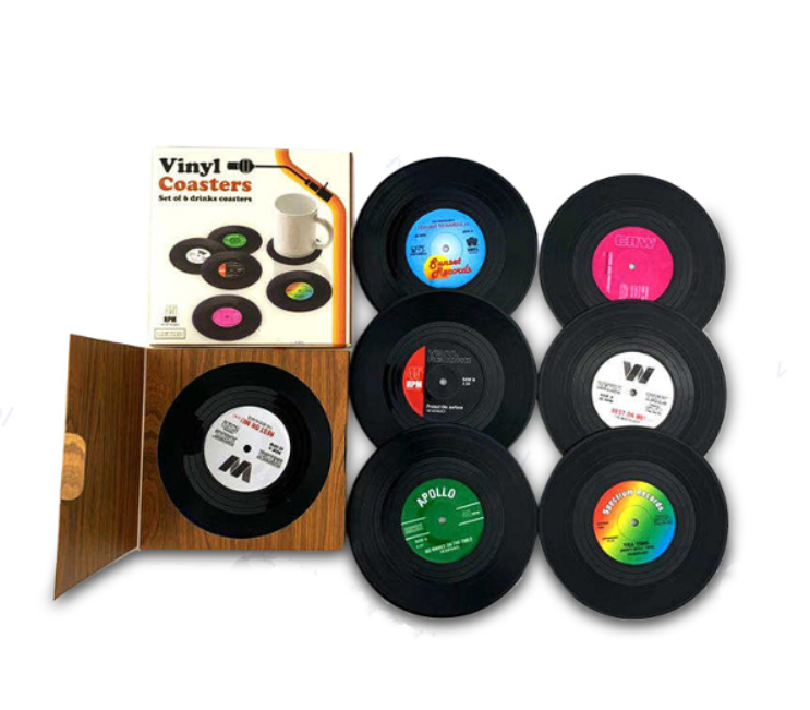 6 תחתיות ויניל רטרו מסוגננות עם בסיסי גומי נגד החלקה. עיצוב שונה לכל אחת.