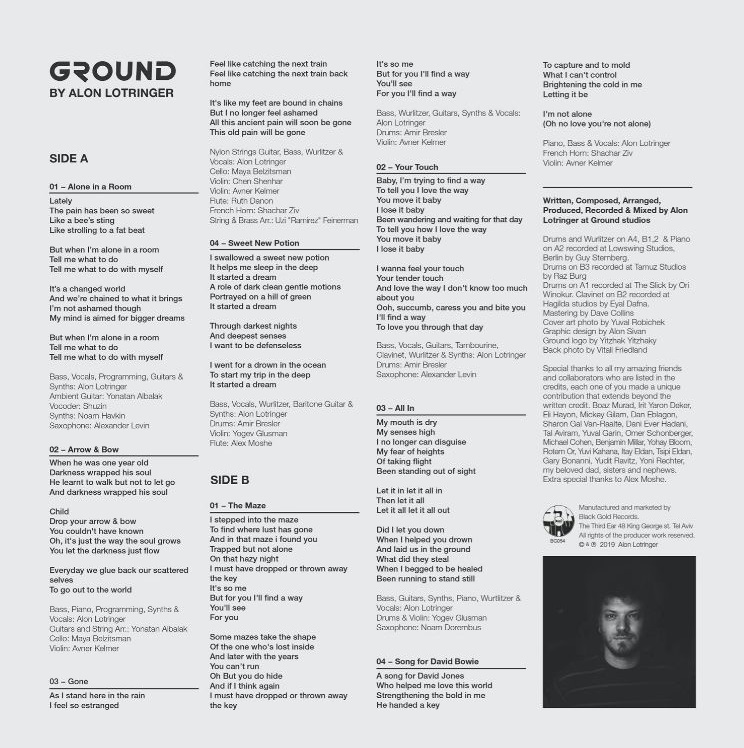 אלון לוטרינגר הוא זמר, יוצר, מפיק ומולטי- אינסטרומנטליסט מהבולטים במוזיקה הישראלית בשנים האחרונות. לוטרינגר פרץ לתודעה לראשונה כסולן להקת "מּורה" לצד עומר קליין ושחר ברבש. זמן קצר לאחר מכן הוציא את אלבומו הראשון ״ביער של טורקיז אפור״ שזכה לשבחי המבקרים והקהל. מעבודותיו הבולטות כמפיק מוזיקלי - אלבומו האחרון של יוני רכטר ופרויקטים מקומיים ובין לאומיים של אבי בללי ויהודית רביץ, רוני אלטר, דניאלה ספקטור, דאנה איבגי ועוד. לצד עבודתו כמפיק, עמל בשנתיים האחרונות על "Ground" , אלבום הסולו השני שלו, והפעם באנגלית. בעוד ההשפעות של לוטרינגר מגוונות ונעות מארט רוק לאר אנד בי קלאסי, מחקירות אמביינט בהשראת בריאן אינו, לגרוב בהשפעת פרינס, הוא יצר אלבום מרתק ועשיר שמהדהד את מסעותיו הפנימיים בשנים האחרונות. הפקת האלבום החדש החלה בנגינת דואו חיה עם המתופף אמיר ברסלר באולפן בברלין והמשיכה בעבודה מוקפדת של לוטרינגר באולפן שלו, כשהוא מנגן את רוב הכלים, ולעתים מארח מוזיקאים כמו יוגי, יונתן אלבלק, עוזי רמירז, שוזין ומאיה בלזיצמן.Tracklist: A1 Alone In A Room A2 Arrow & Bow A3 Gone A4 Sweet New Portion B1 The Maze B2 Your Touch B3 All In B4 Song For David Bowie