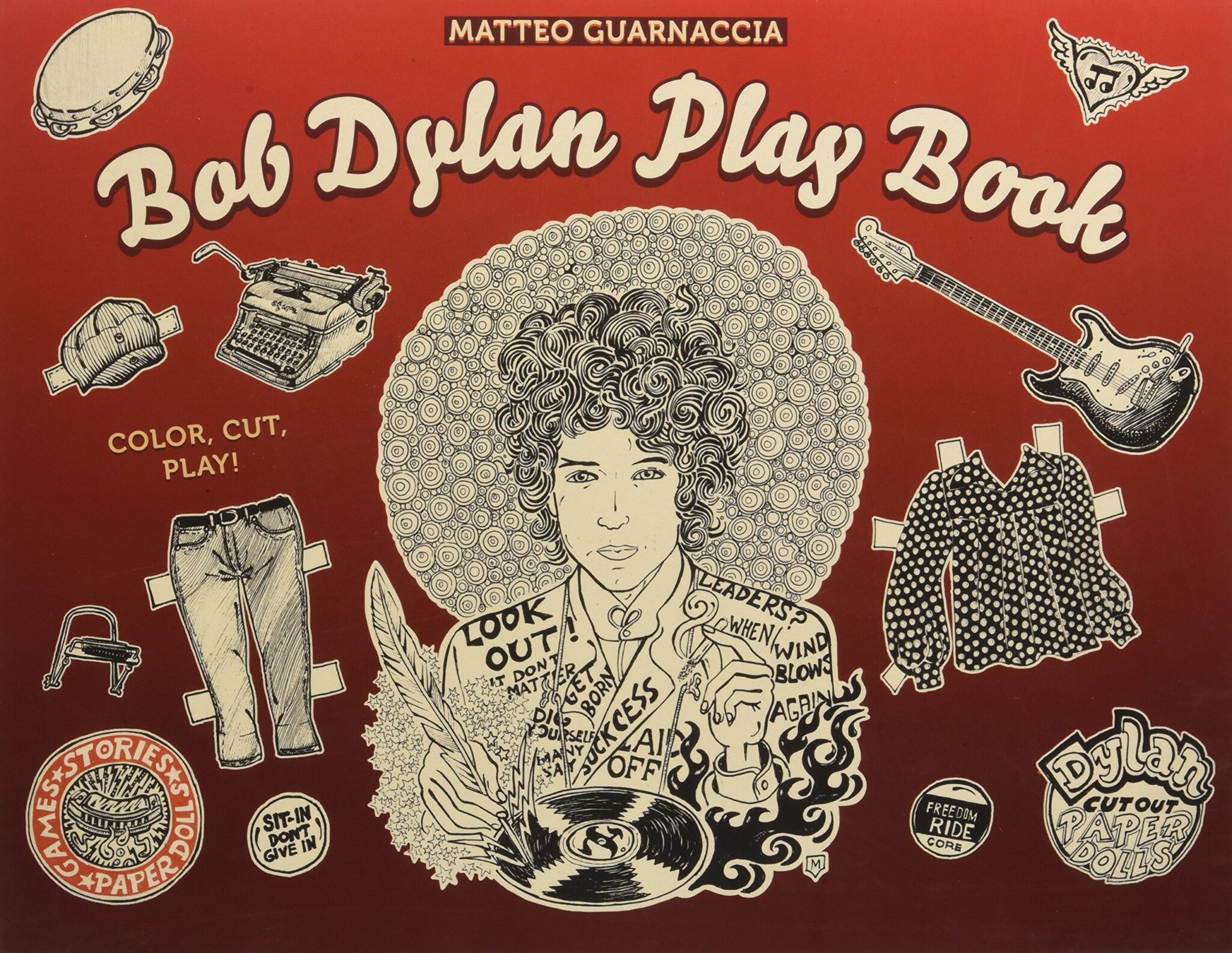 Beginning with rockabilly, moving on to folk music, sliding over to electric, and falling into a psychedelic phase, like a chameleon Bob Dylan has changed his skin repeatedly over the years, juggling his image with apparent ease and subverting the prevailing social and aesthetic models each time. His Supro guitar and the leather jacket – reminiscent of James Dean; the muse of his hobo period Suze Rotolo and his legendary Triumph Bonneville; the Newport Jazz Festival and the Gaslight Cafe in Greenwich Village: artist Matteo Guarnaccia has documented this pilgrimage of styles stage by stage, year by year, with a wealth of detail. The clothes, faces, music and places of those years become subjects to colour in, paper-dolls to dress, and board games to assemble, while the characters of his songs provide the members of a colourful circus. This is the ultimate collector's activity-book to be approached with glue, scissors and colouring pencils, dedicated to all the fans of the legendary singer-songwriter.