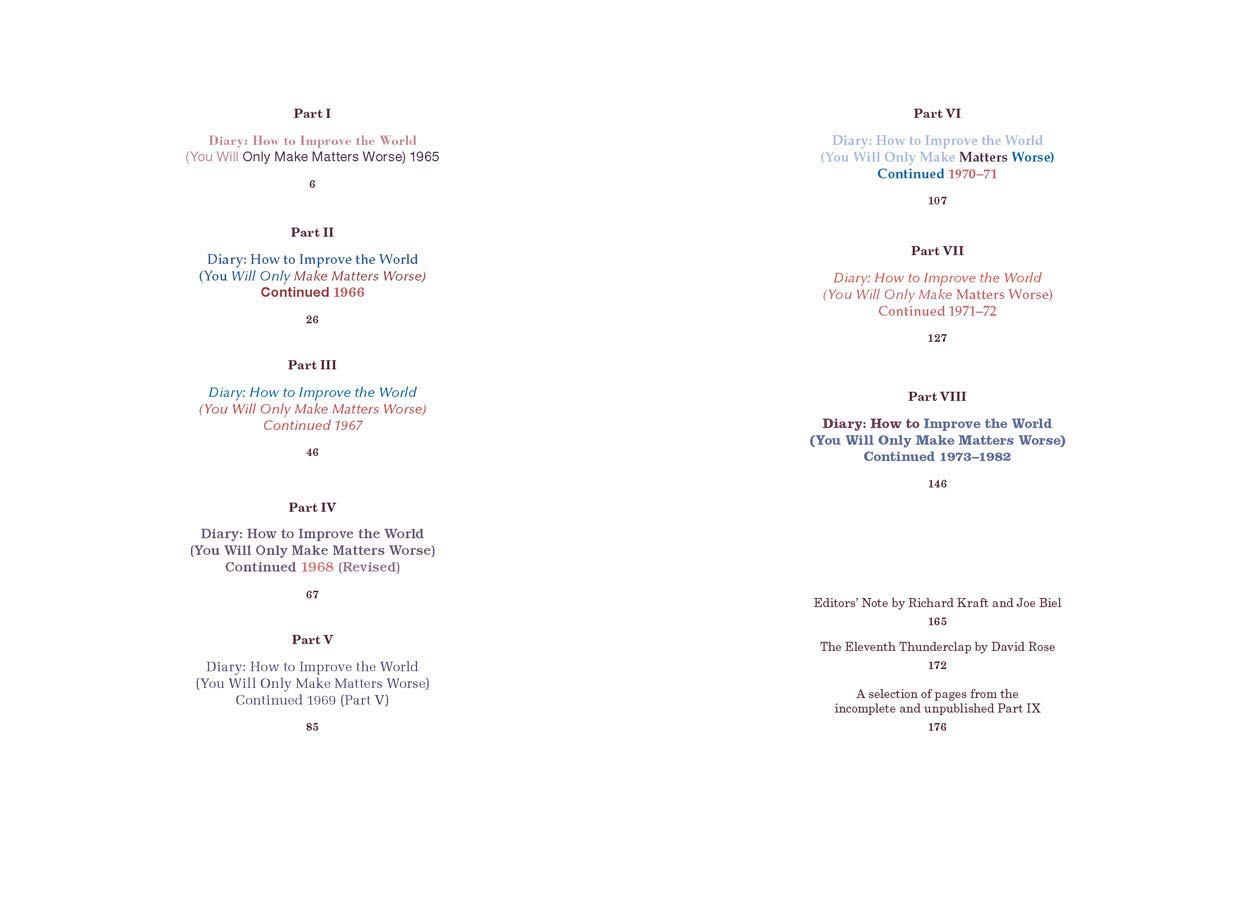 Now available in an expanded paperback edition, Diary registers Cage's assessment of the times in which he lived as well as his often uncanny portents about the world we live in now. With a great sense of play as well as purpose, Cage traverses vast territory, from the domestic minutiae of everyday life to ideas about how to feed the world. He used chance operations to determine not only the word count and the application of various typefaces but also the number of letters per line, the patterns of indentation, and–in the case of Part Three, originally published by Something Else Press–color. The unusual visual variances on the page become almost musical as language takes on a physical and aural presence. While Cage used chance operations to expand the possibilities of creating and shaping his work beyond the limitations of individual taste, Diary nonetheless accumulates into a complex reflection of Cage's sensibilities as a thinker and citizen of the world, illuminating his social and political awareness, as well as his idealism and sense of humor: it becomes an oblique but indelible portrait of one the most influential figures of the 20th-century American avant-garde. Collecting all eight parts into a single volume, coeditors Joe Biel and Richard Kraft also used chance operations to render the entire text in various combinations of red and blue (used by Dick Higgins and Alison Knowles for Part Three) as well as to apply a single set of 18 fonts to the entire work. In the editors' note, Kraft and Biel elucidate the procedure of chance operations and demonstrate its application, giving readers a rare opportunity to see how the text is transformed. This expanded paperback edition reproduces the 2015 hardback edition, with a new essay by mycologist and Cage aficionado David Rose and, most important, an addendum that includes many facsimile pages of Cage's handwritten notebook of a ninth part in progress, bringing the reader into compelling proximity to Cage's process and the raw material from which Diary was made.
