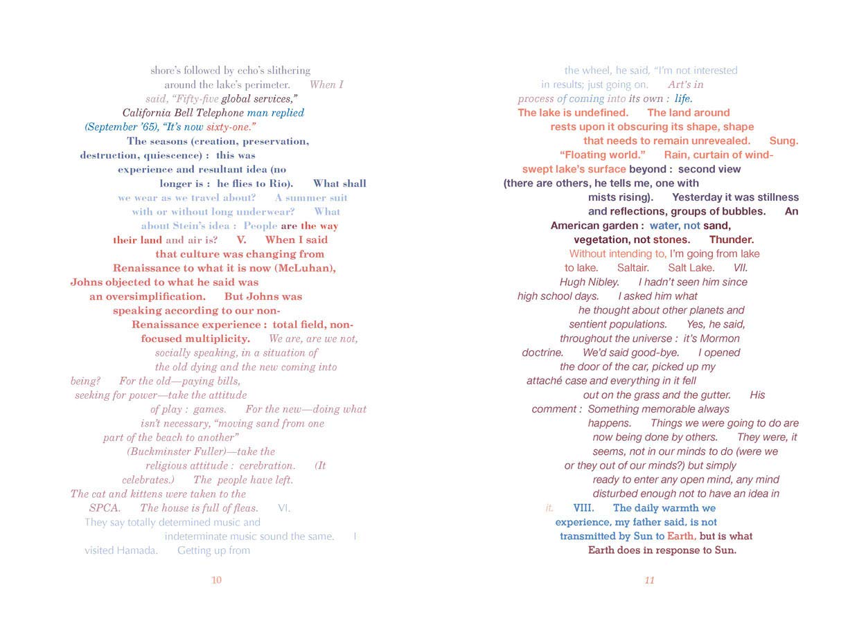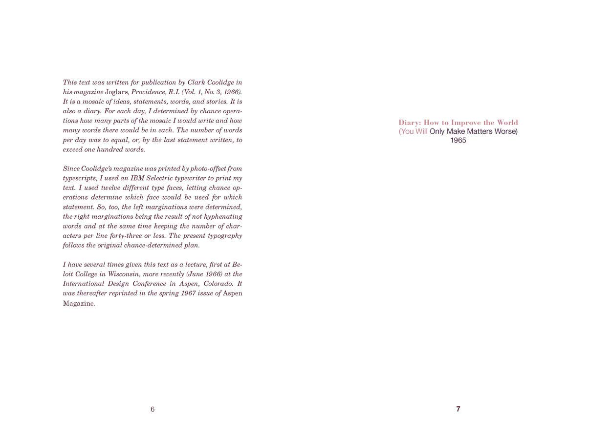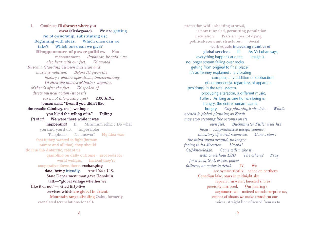 "Over 16 years, beginning in 1965, John Cage compiled anecdotes, observations and koanlike tales, originally typing everything on an IBM Selectric and using chance methods to determine the formatting of texts that twist down each page. The Siglio edition preserves the graphic effects, but, more important, it gives a sense of the company he kept during these years–Marcel Duchamp, R. Buckminster Fuller, D.T. Suzuki–and of his passionate feeling about a world locked in a state of perpetual warfare. Cage has a reputation for being a Zen-inspired wit. He was also much more, an intensely engaged moral thinker." -Holland Cotter, New York Times